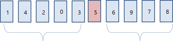 : 이와 같이 피벗이 이동한 상태에서 왼쪽 리스트와 오른쪽 리스트를 살펴보자이제 ‘5’ 왼쪽에 있는 데이터는 모두 ‘5보다 작고, 오른쪽에 있는 데이터는 ‘5’보다 크다는 특징