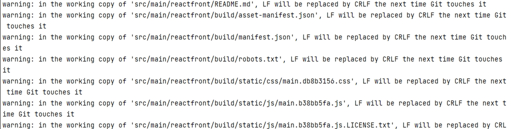 -no-warn옵션을 추가할 수 있습니다. (하지만, 이는 모든 경고 메시지를 숨기기 때문에 문제가 발생할 여지가 있습니다.)cssCopy code git add --no-warn src/main/reactfront/원인 파악 및 해결: 경고 메시지를 직접 읽고 원인을 파악한 뒤에 그 원인을 해결하는 것이 가장 좋은 방법입니다. 예를 들어, 대용량 파일에 대한 경고가 나오면 해당 파일을 **